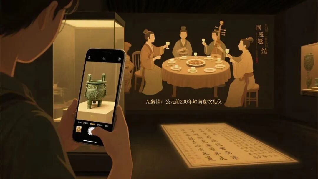在广州博物馆扫描 “镇海楼” 模型,AI 会自动匹配《广东通志》记载,并推送由 AI 生成的粤语有声小说。南越王博物院的 AR 导览更神奇:扫描青铜提筒,手机屏幕立即浮现汉代宴饮场景,连酒器中的米酒香气都能通过嗅觉装置模拟。