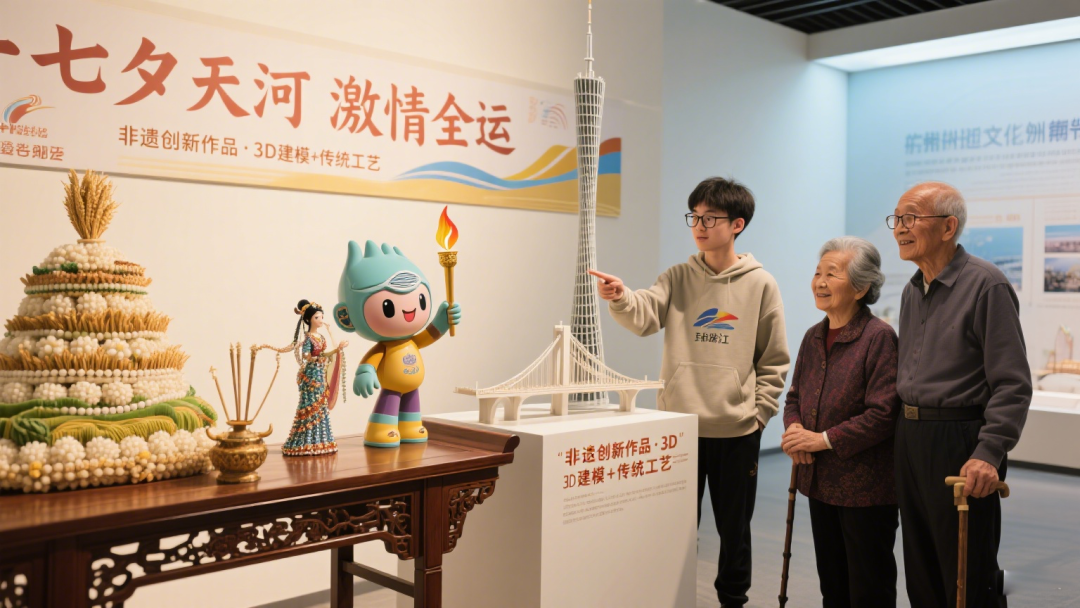 以前看乞巧供案,总觉得是老手艺人们的 “专属战场”,但这次在广州乞巧文化博物馆,00 后小哥黄奕铮直接把全运会元素 “打印” 进了传统供案!